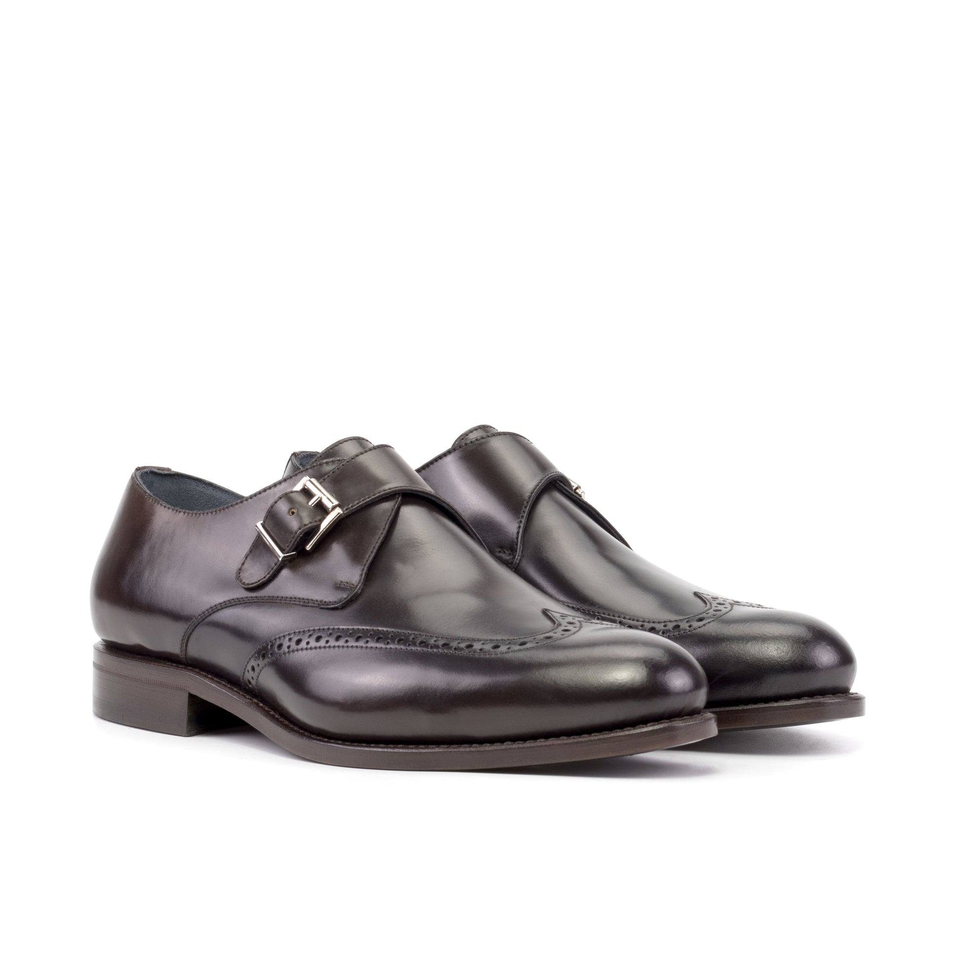Presenting a sophisticated pair of monk strap shoes, each exuding timeless elegance with a modern touch. The first shoe is crafted from rich, dark brown leather, its sleek surface accented by classic brogue detailing along the edges. A single, polished silver buckle secures the strap, offering a refined and adjustable fit.